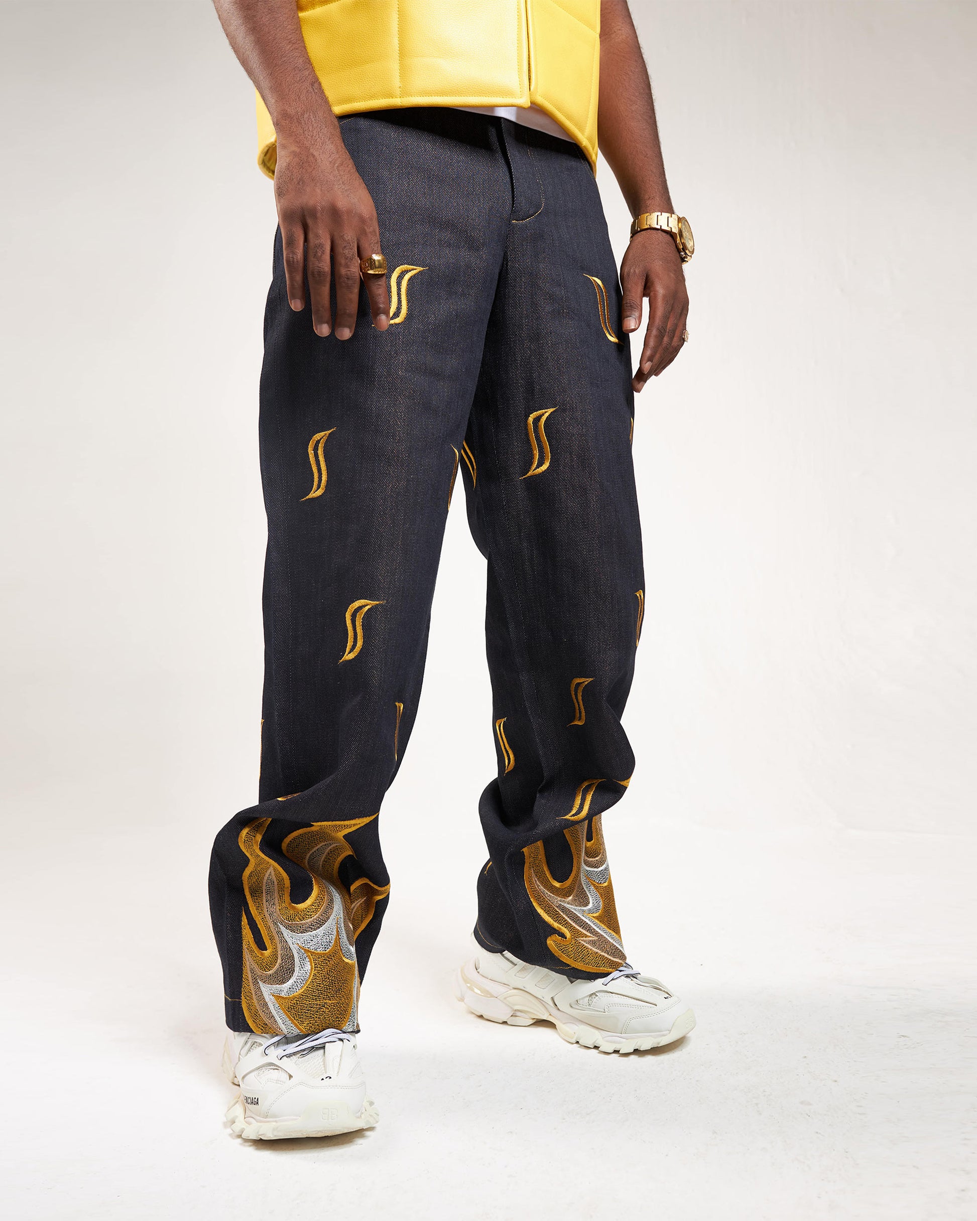 These Denim Pants are statement piece, super stylish with fire art work embroidered directly onto the fabric. Made with high-quality Denim, these pants are built to last and look great.